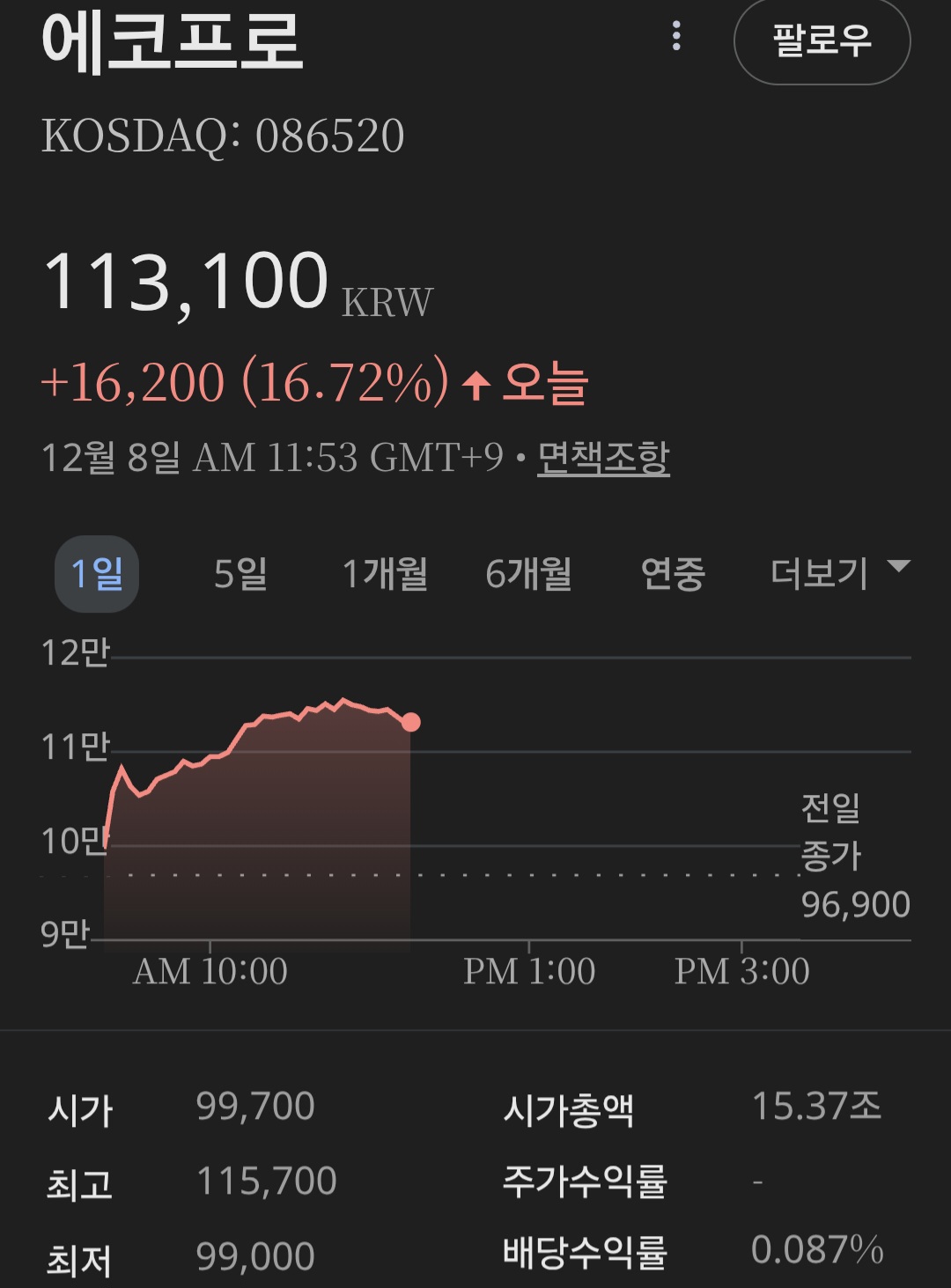 8일 오전 장 초반, 에코프로는 전일 대비 약 10% 이상 상승한 10만7,400원대를 기록하며 52주 신고가를 터치했습니다. 이후에도 매수세가 이어지면서 오전 10시 39분 기준 11만3,800원(+17.44%)까지 치솟았습니다.