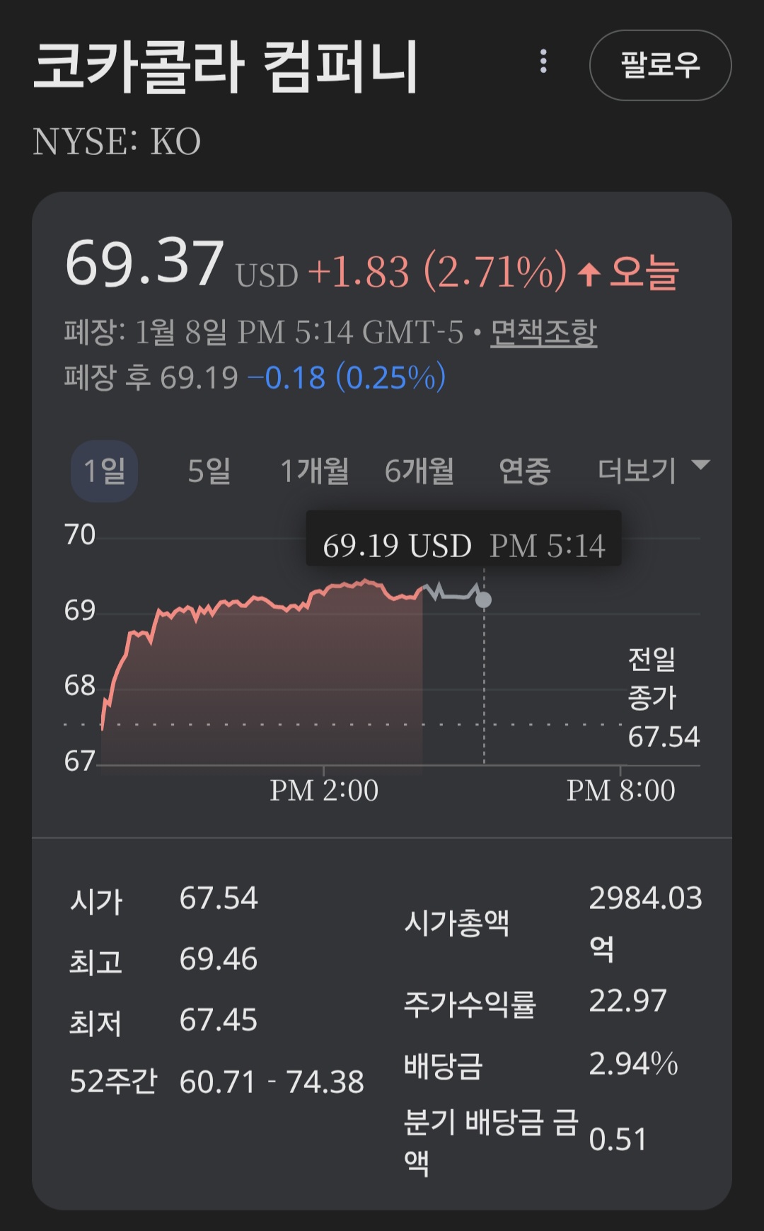 코카콜라는 분기마다 배당금을 지급하는 전통적인 배당주입니다. 현재 기준 주당 배당금은 0.51달러이며, 연간으로 환산하면 약 2.04달러 수준입니다. 이를 바탕으로 계산한 연간 배당 수익률은 약 3.01%로, 미국 대형 우량주 가운데서도 안정적인 수준에 해당합니다.