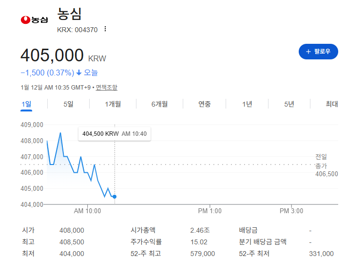 먼저 농심의 현재 주가 상황부터 살펴보겠습니다.